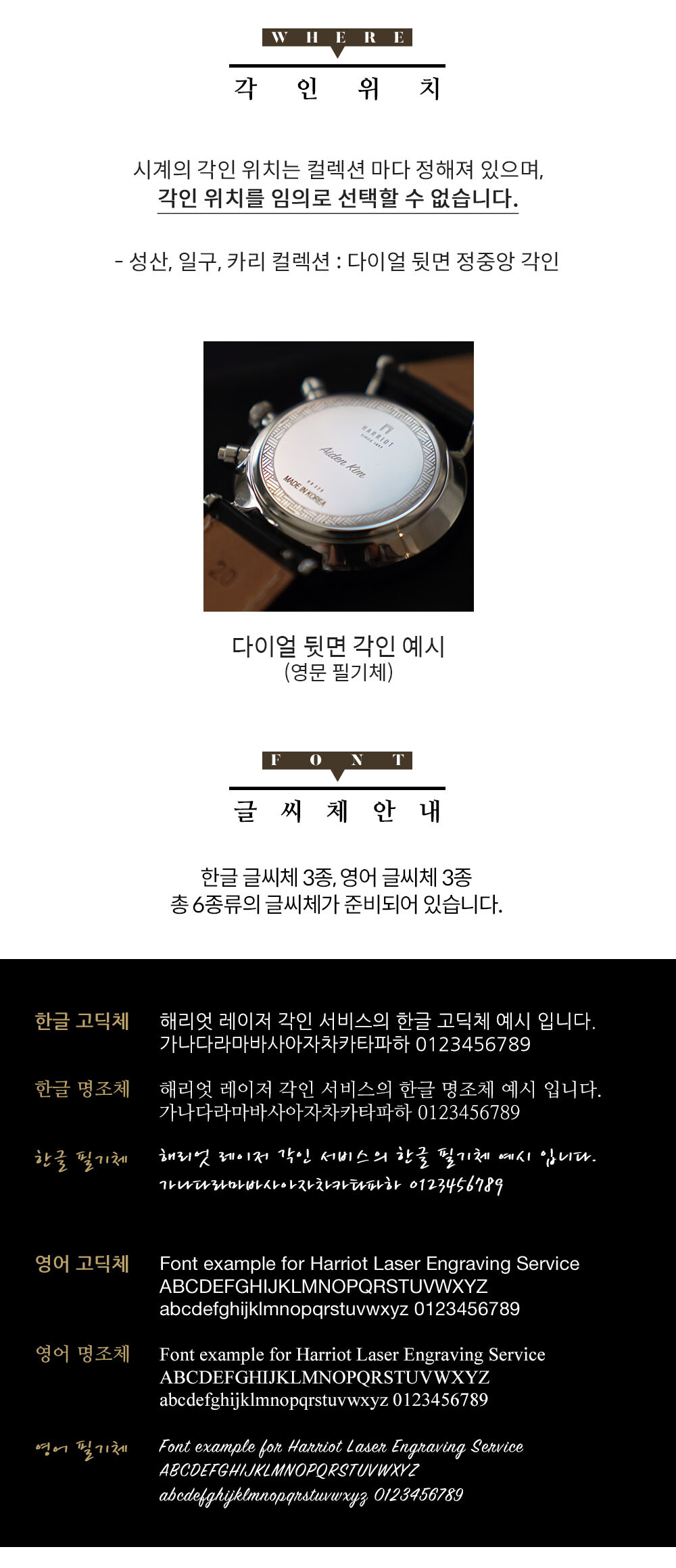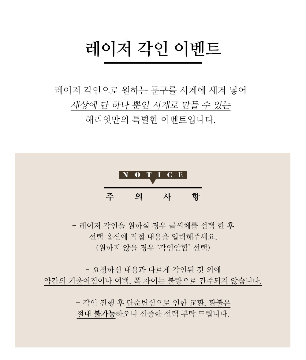 다만 각인서비스를 이용하실 경우 교환 및 환불이 불가능하며, 혹 제품에 이상이 있을 경우에는 새 제품 컨디션으로 수리 및 부품을 교체해 드리고 있습니다.
