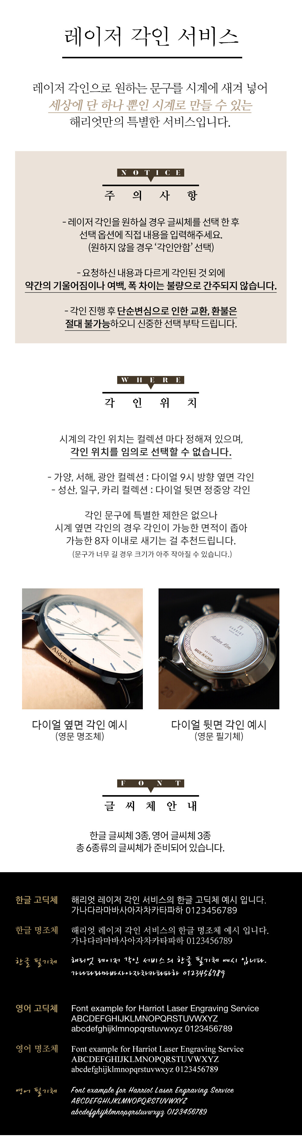 다만 각인서비스를 이용하실 경우 교환 및 환불이 불가능하며, 혹 제품에 이상이 있을 경우에는 새 제품 컨디션으로 수리 및 부품을 교체해 드리고 있습니다.